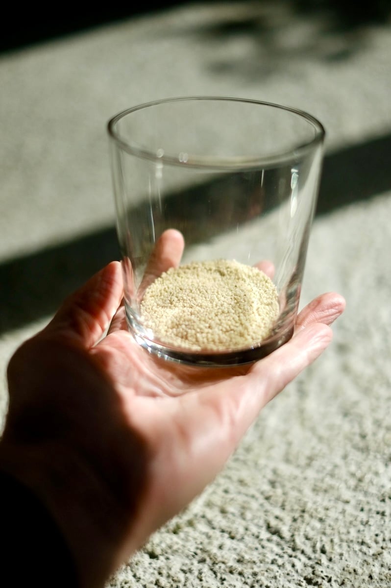 カップに使う分量の雑穀を入れ、水を入れ、指でくるくると回して洗います。