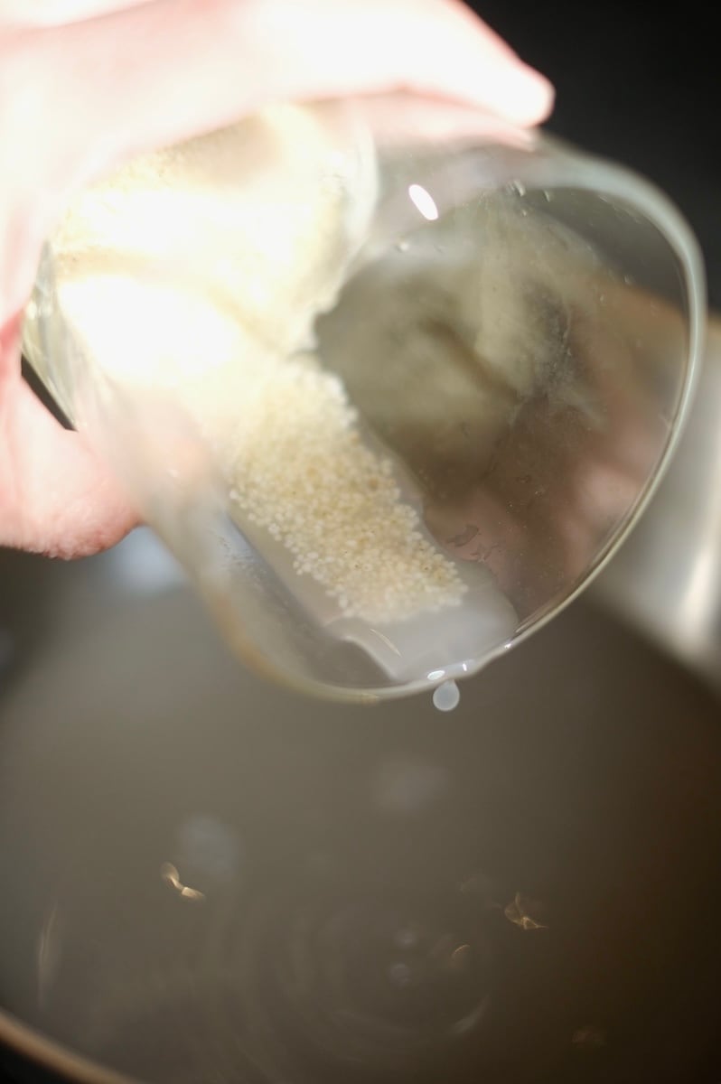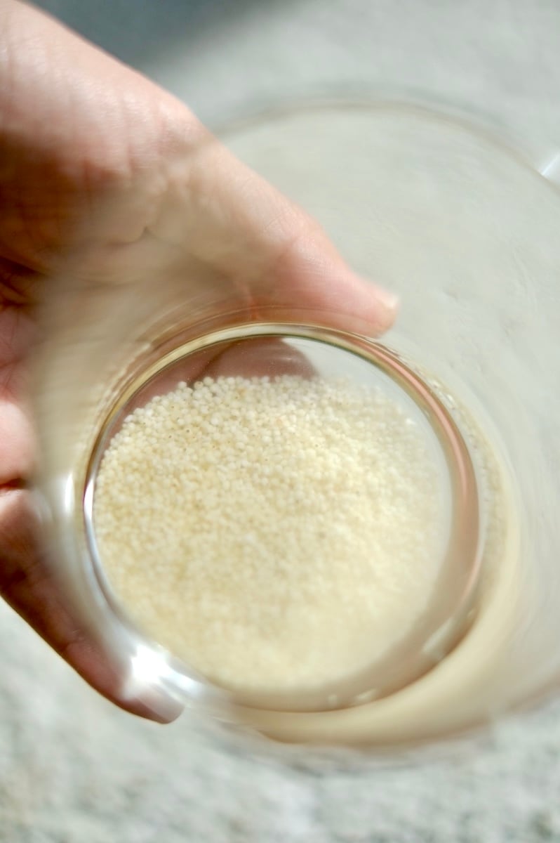 カップに使う分量のいなきびを入れ水を注ぎます。指でくるくるとかき混ぜて水を捨てるを7回繰り返して洗います。