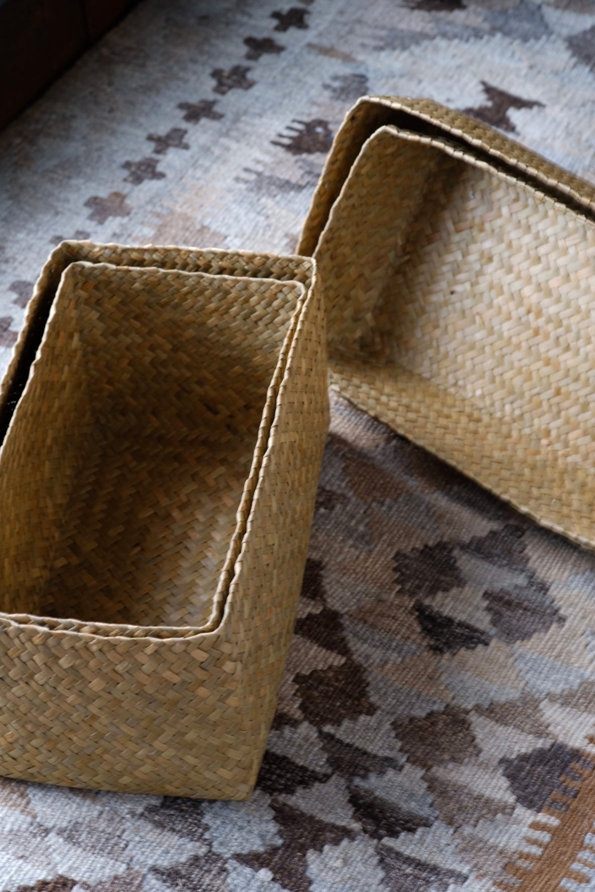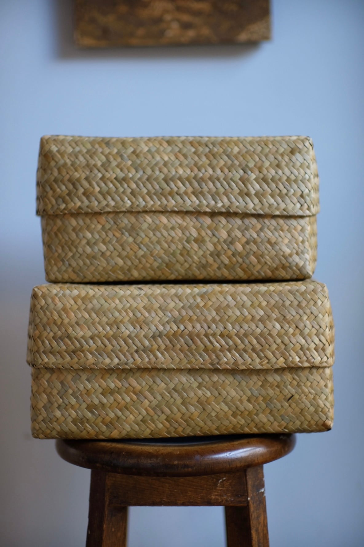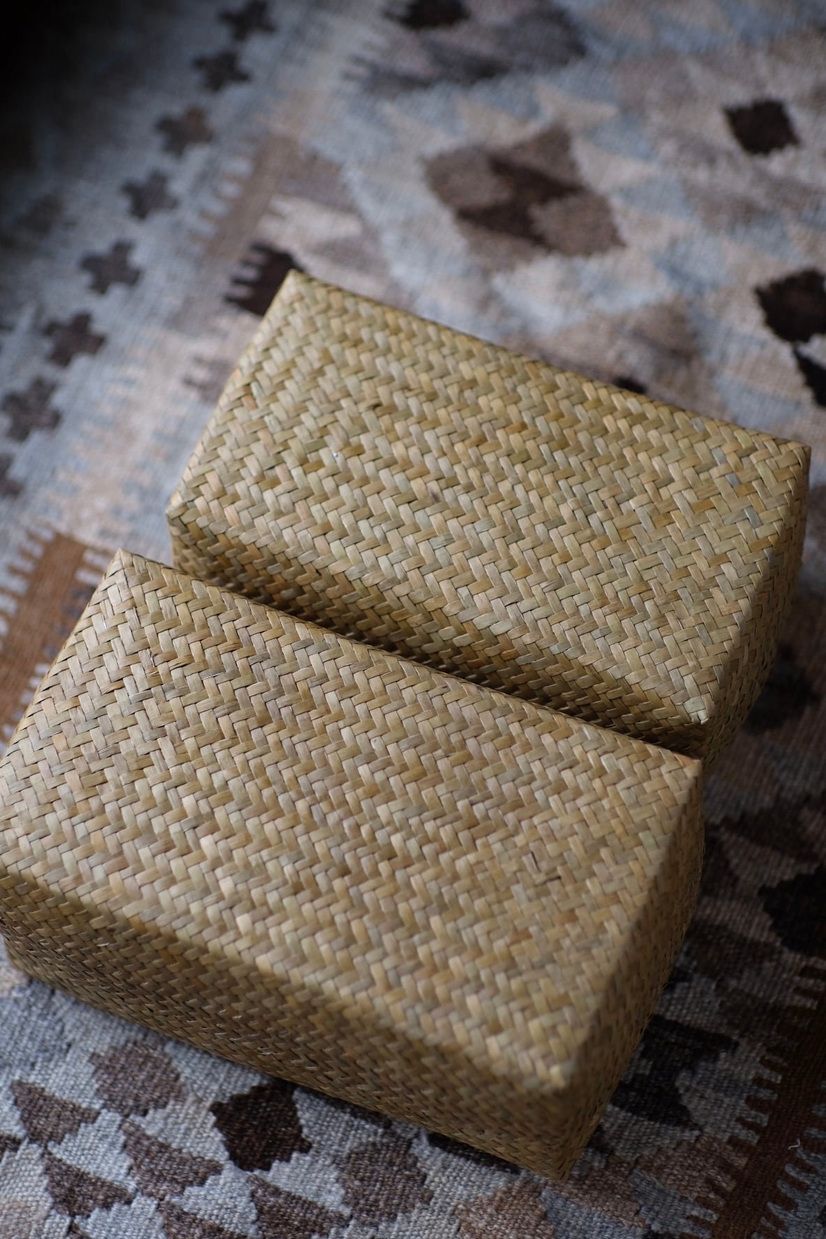 味わい深い天然素材の角型蓋付きストックボックス。