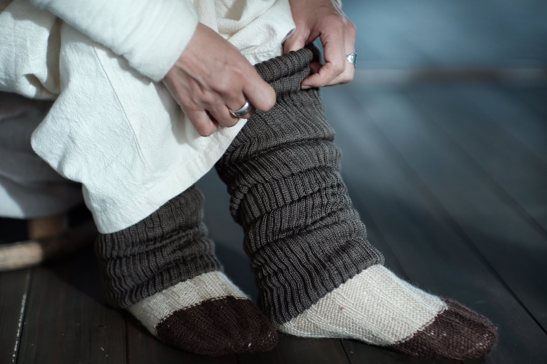 膝丈でふくらはぎをすっぽりと包むレッグウォーマーです。