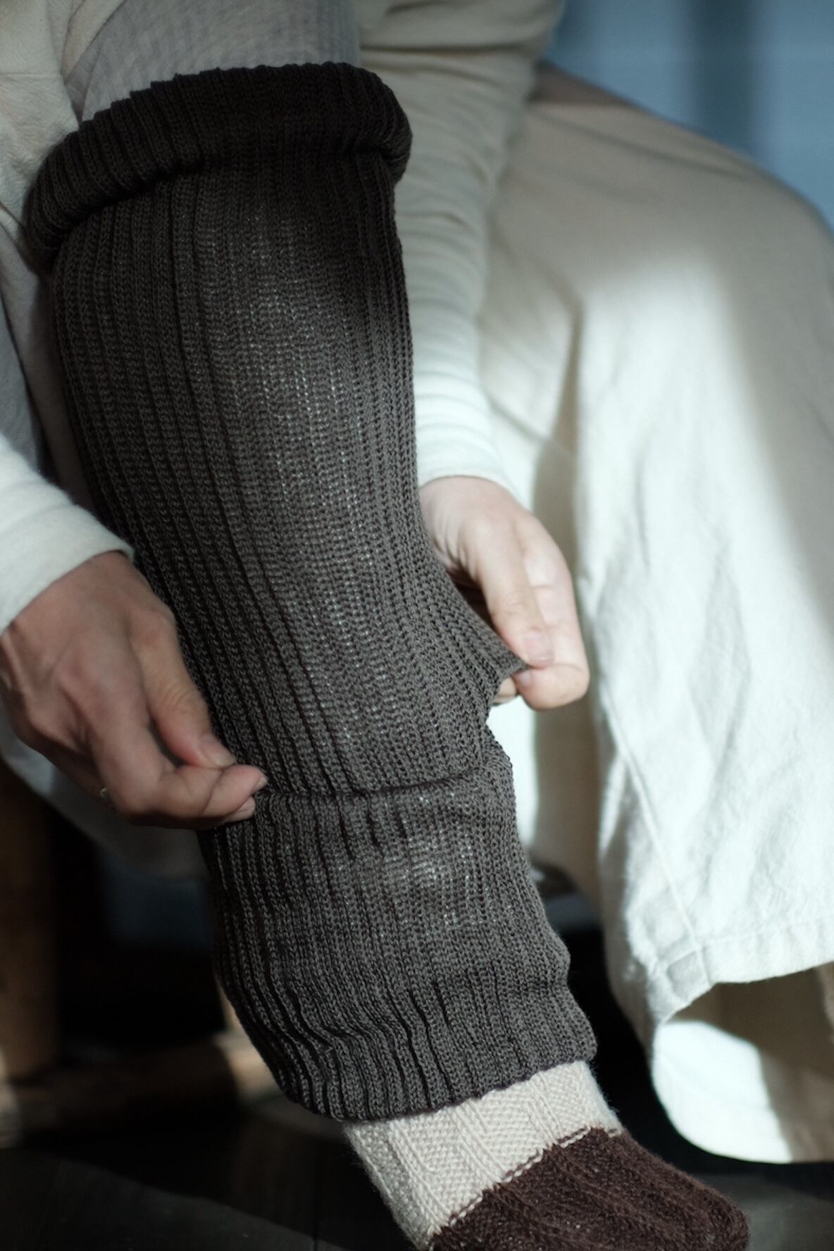 内側がシルク、外側がウールの2重編みになっているレッグウォーマー。